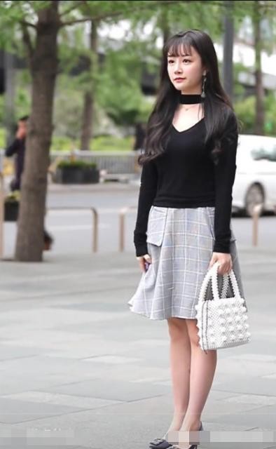 黑色V领上衣搭配灰色格子伞裙,非常知性,肉色丝袜锦上添花,根本看不出来穿了丝袜,这种应该是大多数男生喜欢的女生打扮吧,气质典雅型。