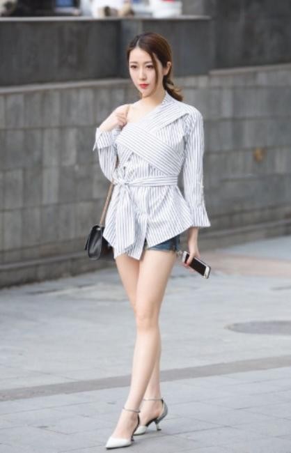 条纹系的不规则上衣搭配牛仔热裤非常时尚,银色的高跟鞋加肉色丝袜整体的颜色都偏浅色调,非常干净自然,而且颜值也非常的高,走在马路上不可谓不是一道风景线。