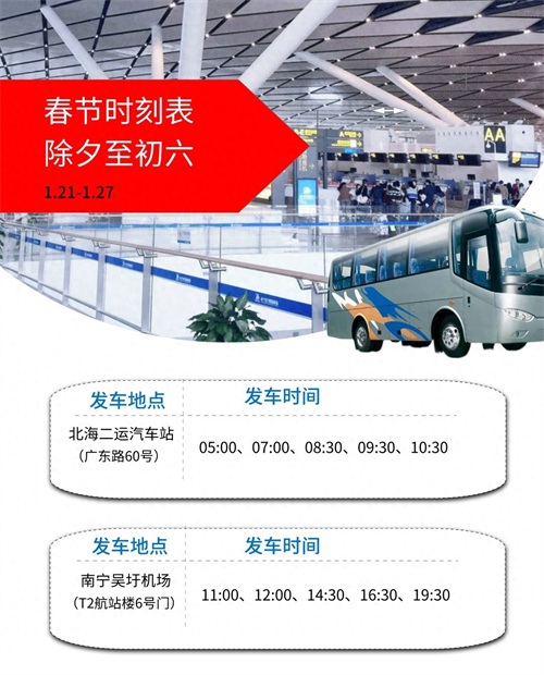 春节期间,北海至南宁机场大巴时刻表出炉啦,记得收藏备用!
