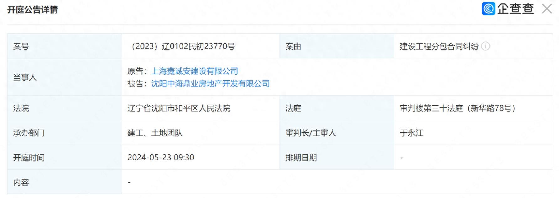 据企查查披露,上海鑫诚安建设有限公司诉沈阳中海鼎业房地产开发有限公司建设工程分包合同纠纷一案,将于5月23日上午开庭,案号为“(2023)辽0102民初23770号”。
