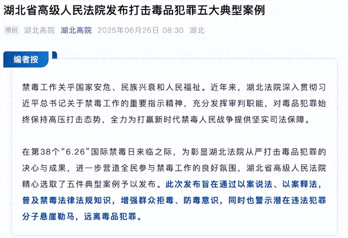 6月26日“国际禁毒日”当天,湖北省高级人民法院发布5起打击毒品犯罪典型案例,其中包括“李某因吸食毒品致幻后杀害三人,依法判处死刑”一案。