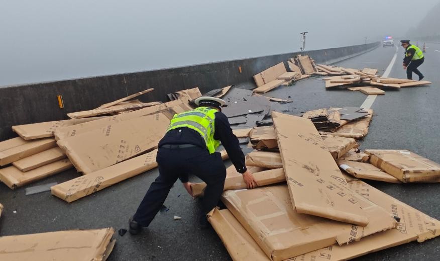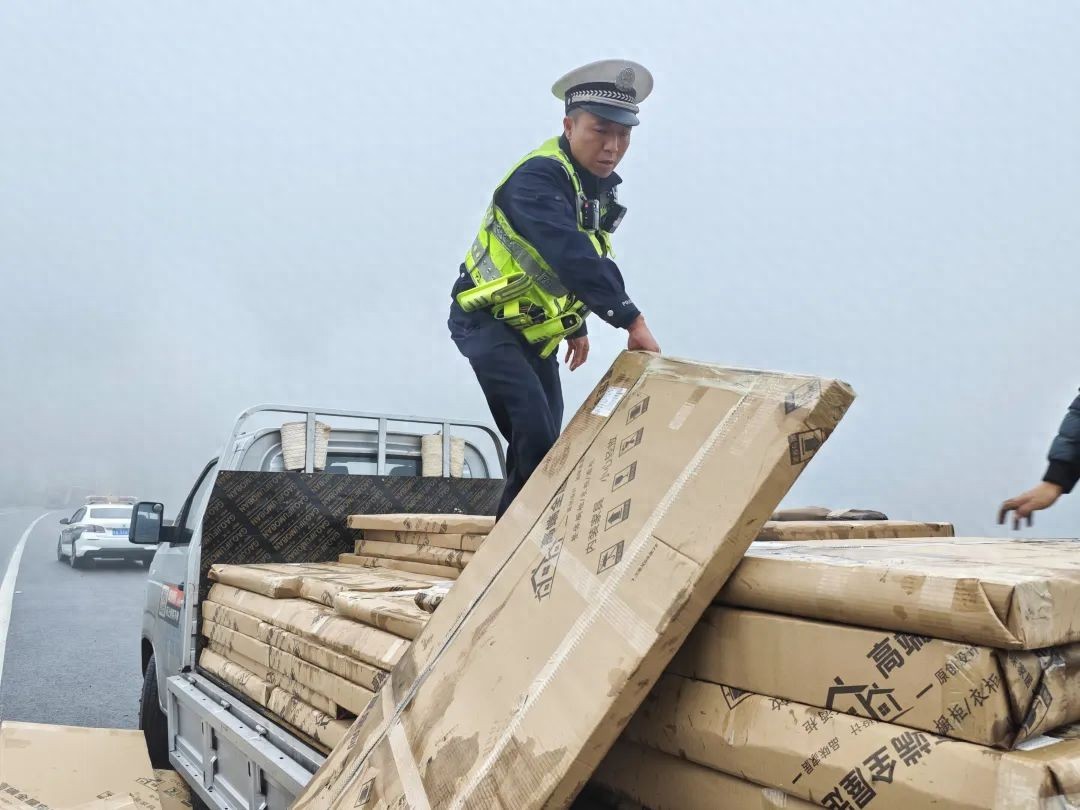 面对如此危急情况,民警们迅速采取行动。他们首先拉响了警报,并立即通知路政、应急和消防部门前来支援。为了确保过往车辆安全,民警们还加长了锥桶的摆放距离,设置了足够的安全警示区域。