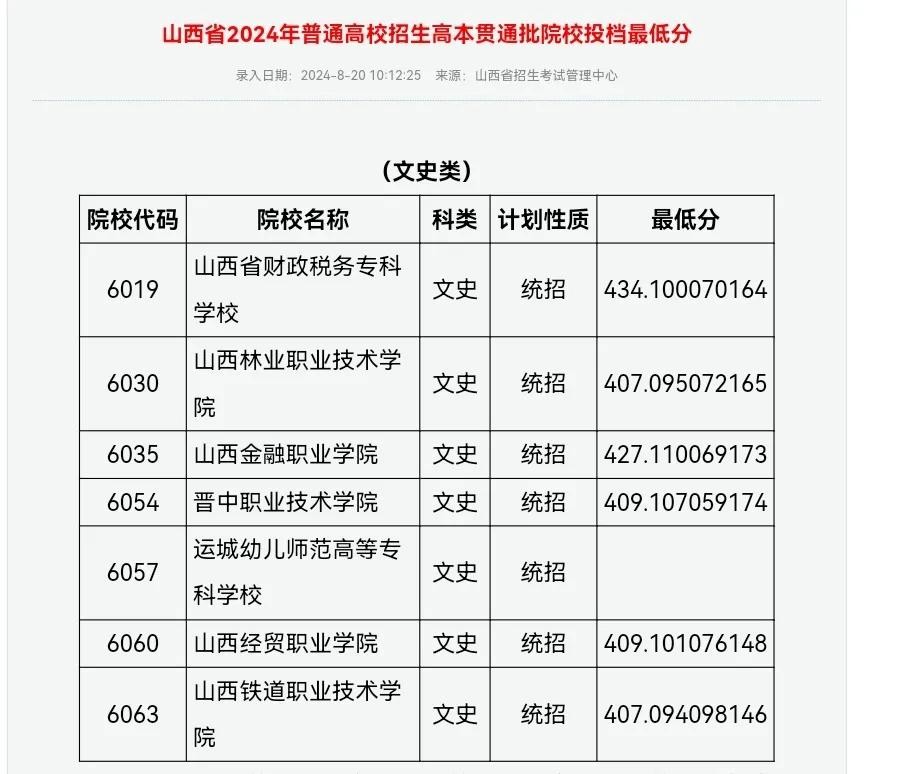 2024年山西普通高考高本贯通批院校最高投档分是山西省财政税务专科学校。