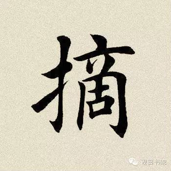 右部“啇”端庄平稳,基本对称稍带左收右放。点笔位置决定着整字的宽窄和松紧,起笔与左边上端平齐,左右距离要写准;第二笔长横在左边短横的稍上一点露锋入笔,不要重,稍抗肩,过点笔后渐平,稍呈拱形;点、撇紧凑呼应,稍偏左;下面“冂”宽窄适当,左轻右重。左竖起笔与左边挑尖基本平齐,竖身要轻,稍左斜;横折钩起笔留有小气口,横画稍抗肩,略呈拱形;折肩要塌,右竖稍重,稍右斜,与左竖呈相背之势,“跪笔弹锋”出钩,钩角稍低于左边“扌”的钩角,出钩的角度稍平。里面的“古”字上部要收,整体稍靠左。横画轻、短,偏左;竖笔实接起笔,在上面点笔中心的垂直线略偏左一点;小“口”稍扁,上宽下窄,左轻右重。注意里面诸横等距平行。