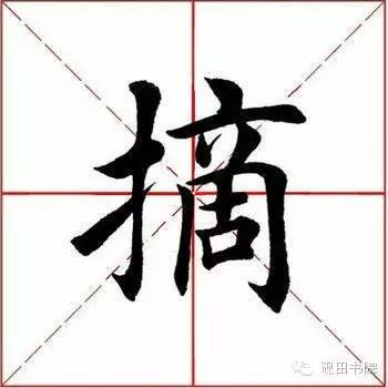 左部“扌”旁为固定写法,左伸右收,不要写宽。短横扛肩稍大;竖钩靠短横的右端下行,劲挺有力,跪笔弹锋出钩,钩不可大;提笔起笔要靠左,切笔后向右上方提笔出锋,过竖笔即止。