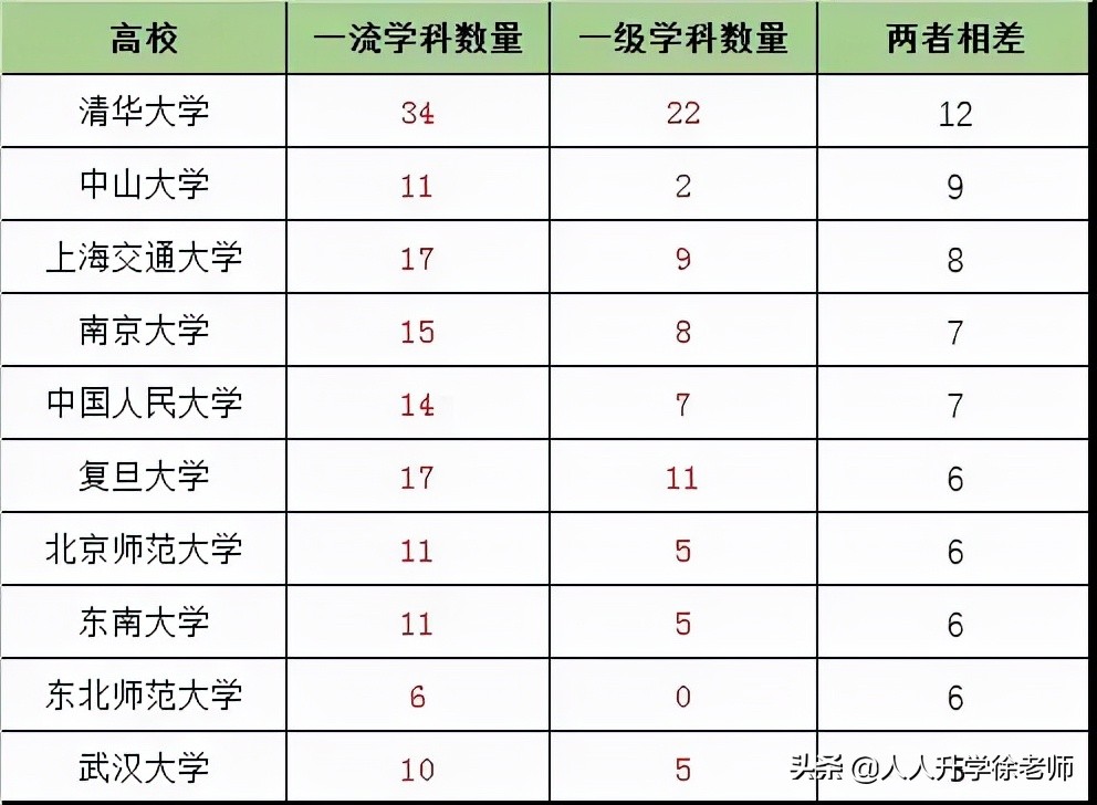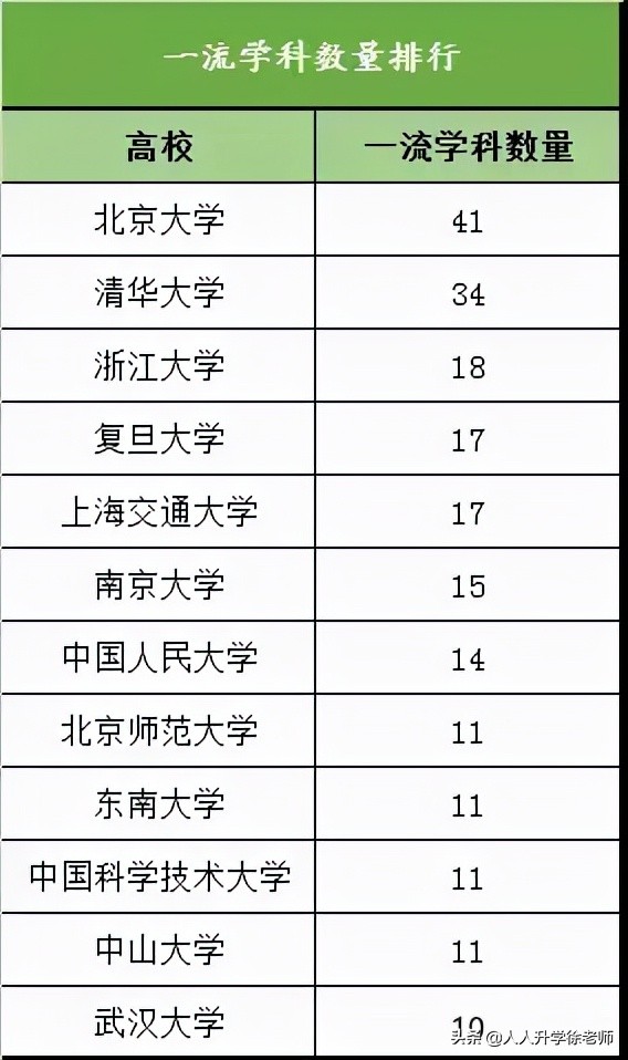 2、在一流学科数量上,清华北大遥遥领先,其中北大以41个一流学科压过清华的34个一阵;