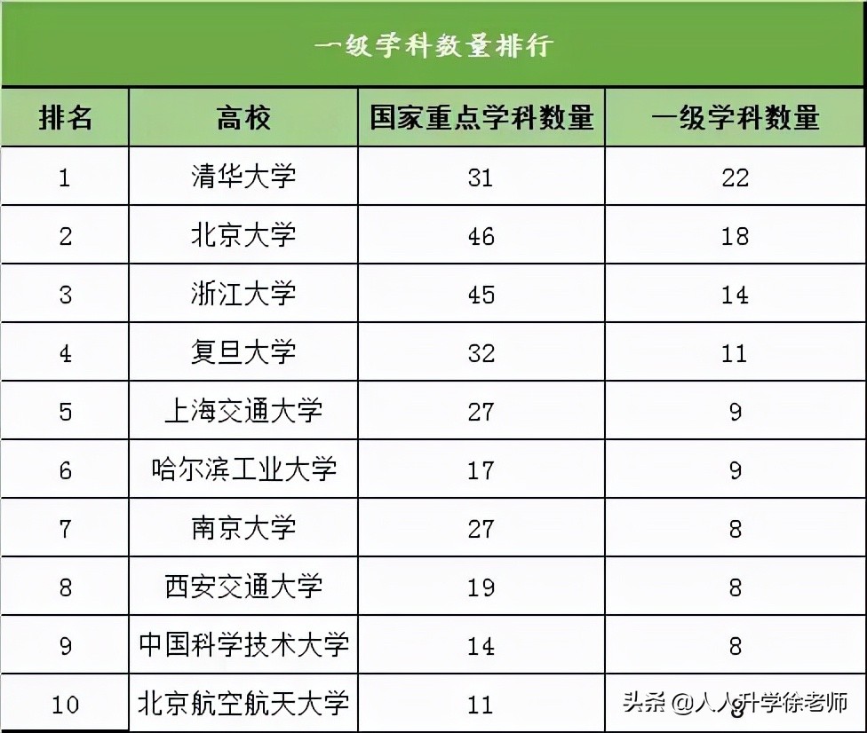 清华学科数量虽不多,但科科精品。随后才是浙大、复旦的14个、11个。