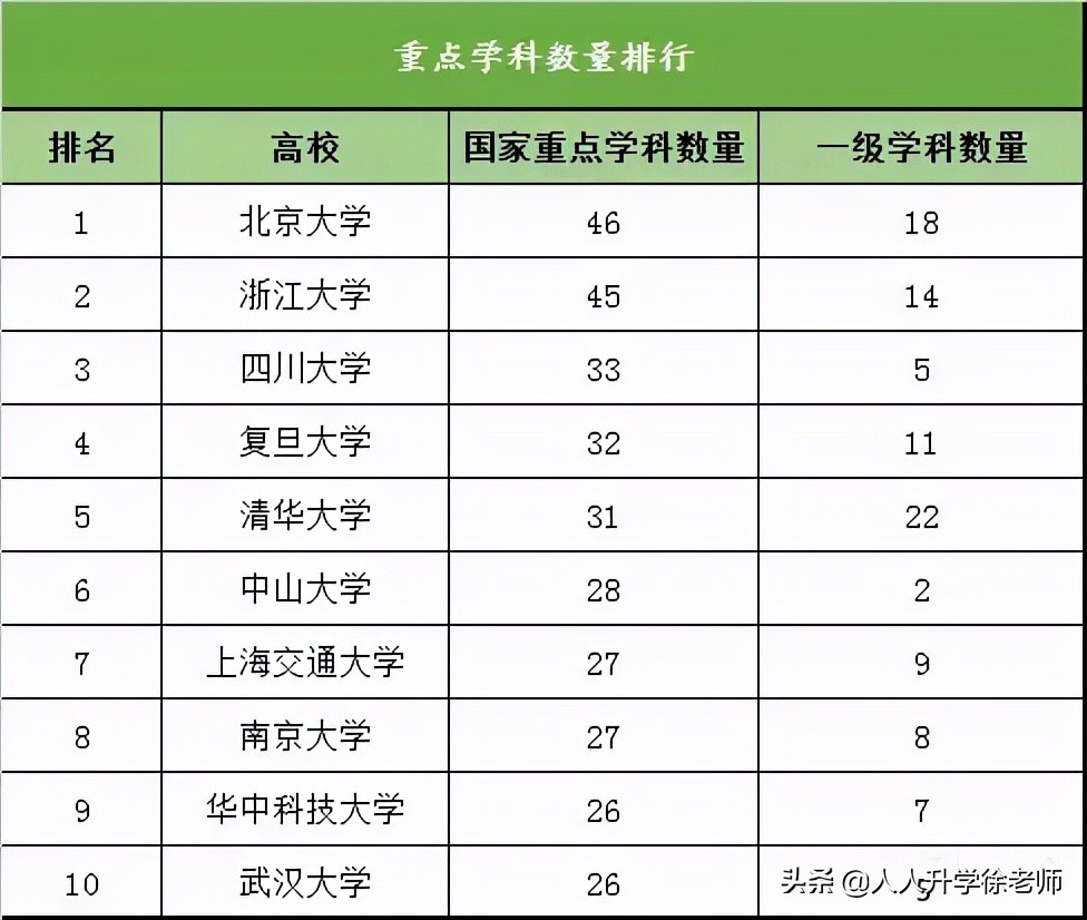 3、而在重点学科排行中,北大46个重点学科位列第一,浙大45个仅落后1科,川大、复旦紧随其后,清华竟落到了第5位: