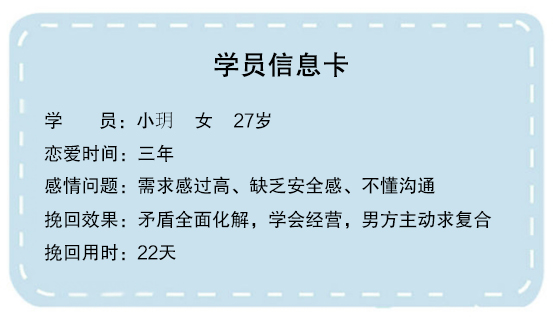 接下来,导师将从学员小玥(化名)的实战挽回案例中,为大家分享一些成功率非常高的流程和技巧,希望能够帮到姑娘们!