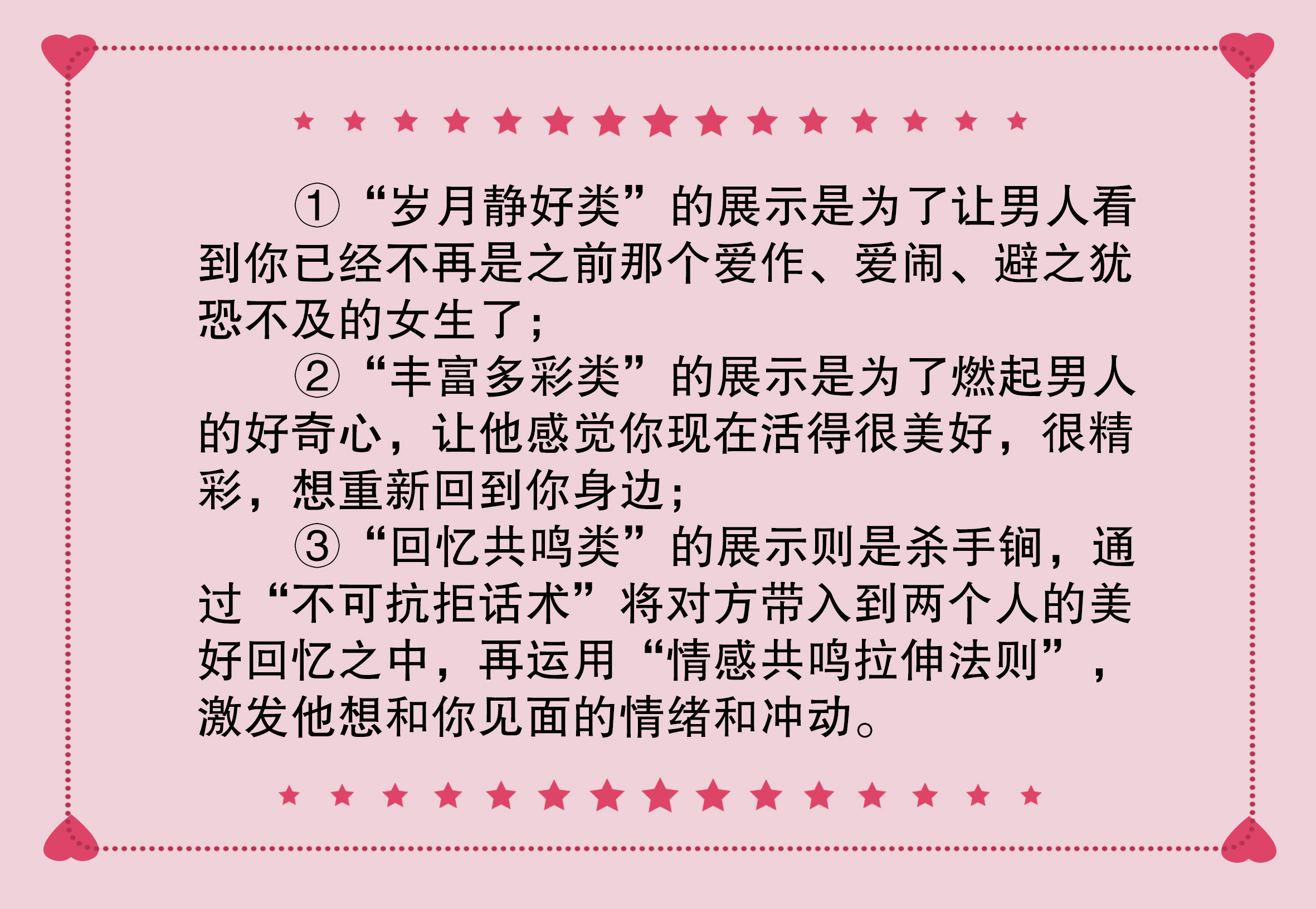 只有通过有效展示,才能让他看到小玥的高价值蜕变,从而放下抵触心理,达成二次吸引!