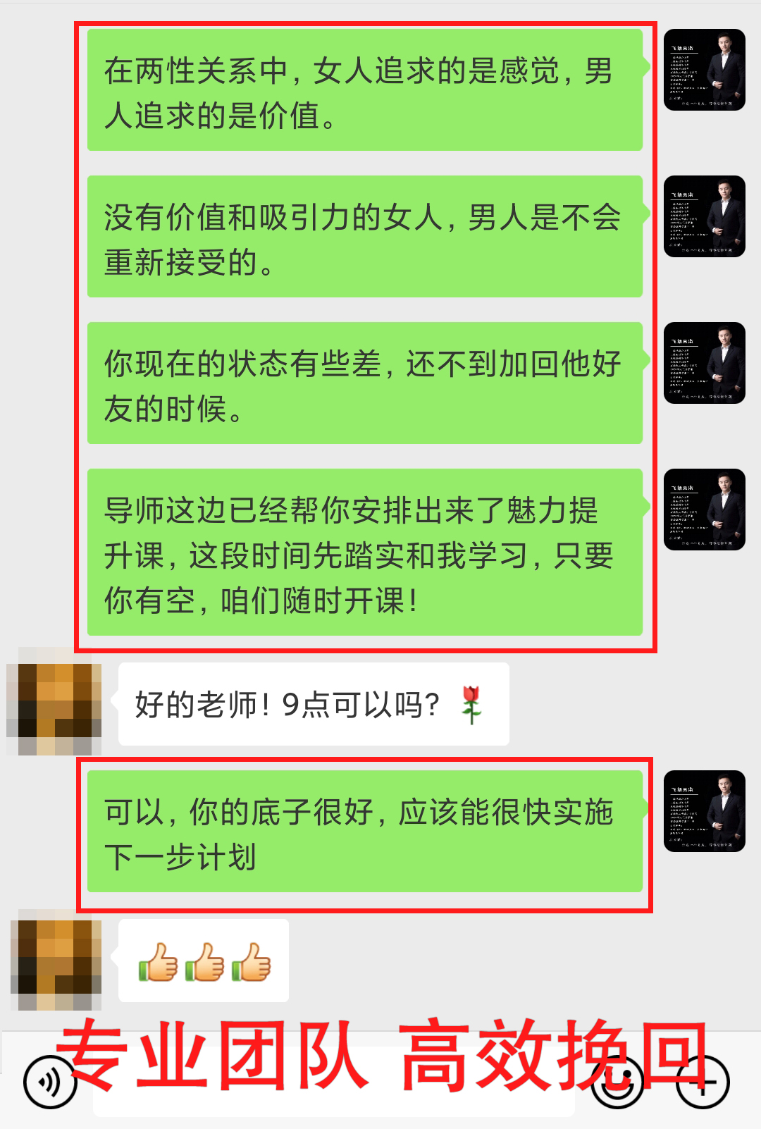 一开始的时候,小玥也比较忐忑,害怕自己的坚持得不到自己想要的结果,但是仅仅学习了两天课程以后,她就被自己的提升惊讶到了。导师指导入微的服务模式,让她感受到了什么才是专业的力量,同时对自己的挽回充满了信心!