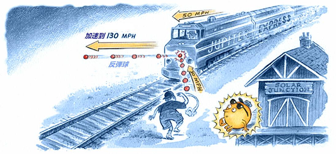 而当火车撞击皮球时,它会将皮球反弹出去,火车司机看到皮球的反弹速度是80千米每小时(这是它撞击火车的速度);