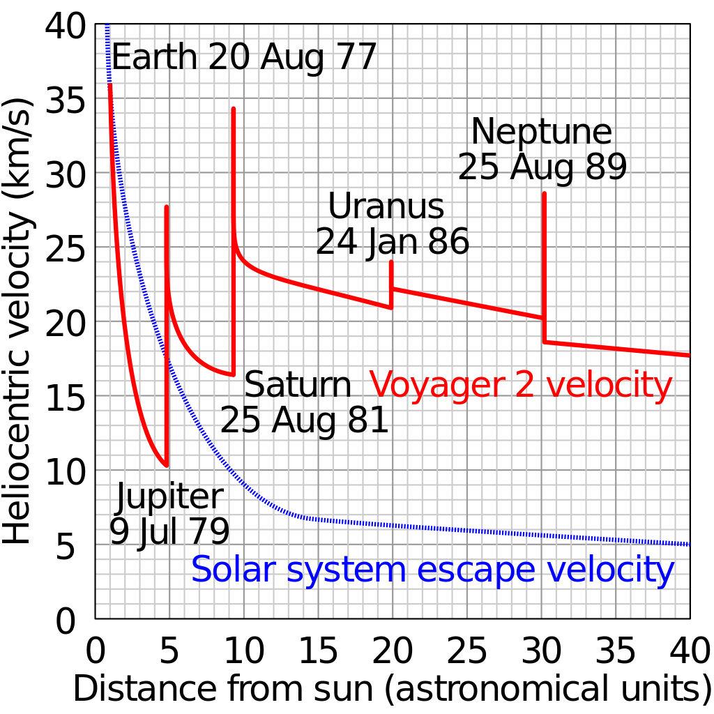 这是因为当航天器接近行星时,受行星引力的影响,航天器会加速;而当它飞越之后,行星的重力势阱反过来会牵引航天器,使其很快减速。在航天器终于摆脱行星引力场时,太阳的引力会作用于航天器,令它的速度一点点地慢下来。这就是为什么旅行者2号在海王星附近一度达到29千米/秒,现在相对于太阳的速度却只有不到15千米/秒的原因。