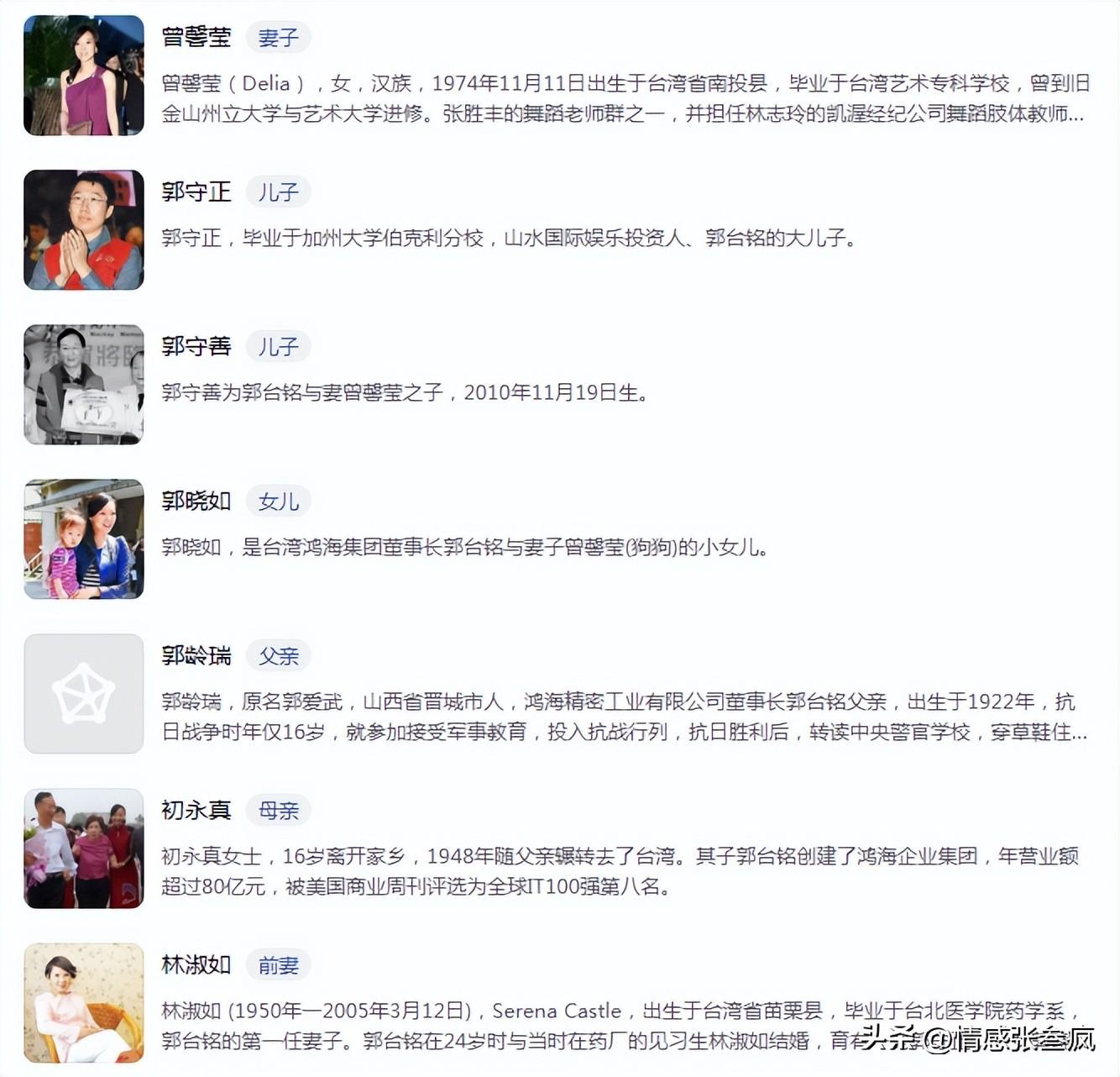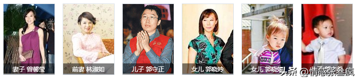 郭台铭前妻林淑如是个富家小姐,不顾父母亲的反对,下嫁给当时是穷小子的郭台铭,当郭台铭冠上了台湾首富的头衔,却发现他的爱妻罹患了乳癌,2005年3月12日(55岁)离开了人间,享年55岁,前妻林淑如育有一子一女,分别为郭守正(大儿子)与郭晓玲(大女儿)。