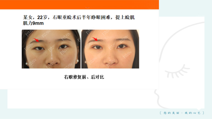 看下这个小姑娘的情况,双眼皮术后出现了大小眼问题,睁眼的时候睁不开,检查肌力发现中度上睑下垂,肌力只有9mm。