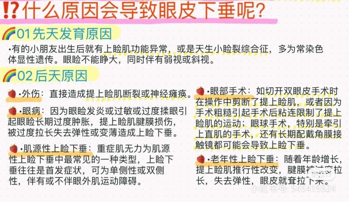 引起提上睑肌功能问题的原因很多,大家在网上都可以查到,不过多阐述了,主要就是先天性和后天性两种。