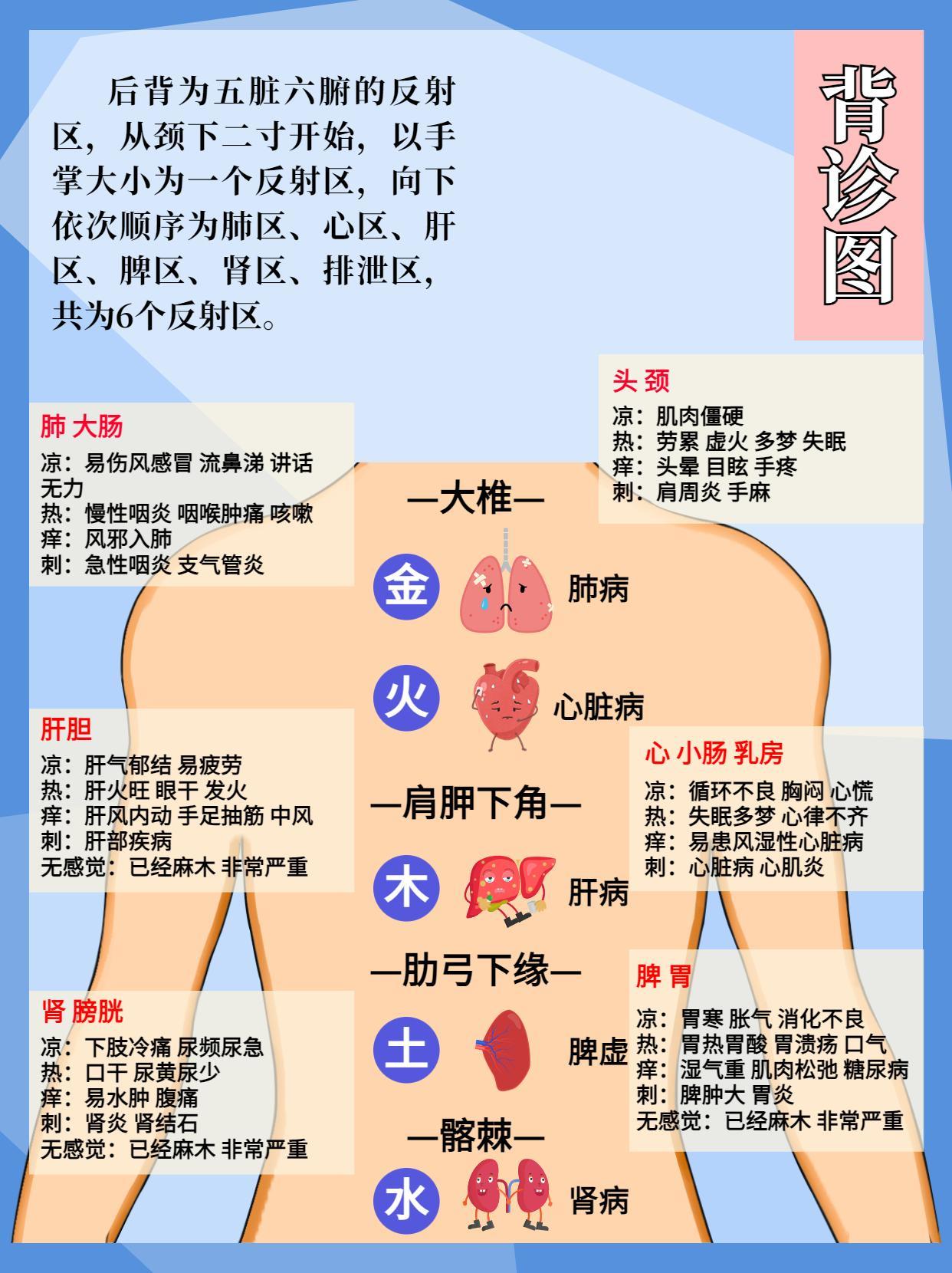 腰部颜后背为五脏六腑的反射区,从颈下二寸开始,以手掌大小为一个反射区,向下依次顺序为肺区、心区、肝区、脾区、肾区、排泄区、生殖区,共为个6️⃣反射区。