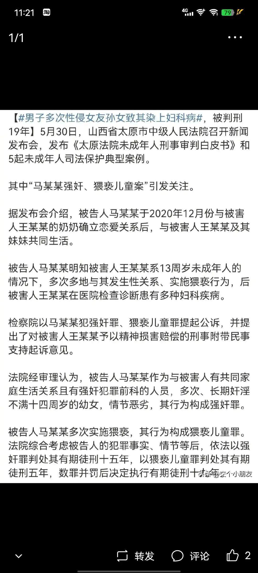 近日,山西省太原市中级人民法院审理了一起侵犯未成年人的案件。案件中,被告人马某某在2025年12月与女孩的祖母确认恋爱关系后,与她们生活在一起。在此期间,马某多次侵犯和猥亵女孩,知道女孩刚13岁还是未成年人,最后因为女孩在医院体检时发现自己患有多种妇科疾病。检察院以马某强奸、猥亵儿童罪起诉,情节恶劣,最终被判处19年监禁。