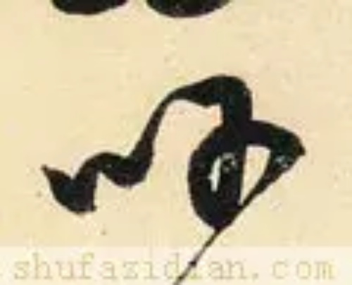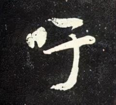 右部“于”字上收下展,不要写宽。短横斜切入笔,与左部折肩对应,向右大抗肩,厚重,勿长,轻收;长横在左部下面起笔,斜切起,抗肩与上横协调,略呈俯视,中间稍轻,到位后,收笔稍下拉,要畅朗舒展。竖钩在首横偏左处不接起笔,向下弯行,过长横后稍长,快到位时边渐给力边稍拐向左下方,接着跪笔弹锋出钩,稍平、稍长,遒健有力。