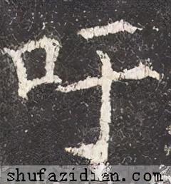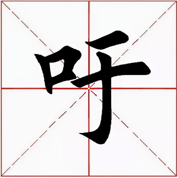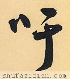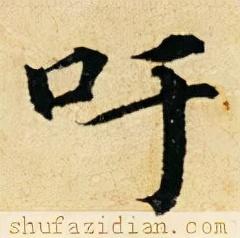 左部“口”旁位置靠上,抗肩右斜,不可写大。左竖稍抖起笔,向下稍右斜,渐轻;横折半虚接起笔,大抗肩,略呈仰视到位后顿笔写竖,左斜;底横实接起笔,与上横平行,收笔托住右竖,过右竖即止。