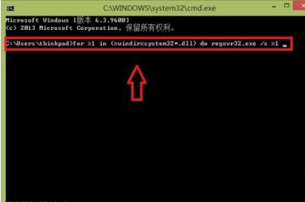 之后,再次输入for %1 in (%windir%system32*.dll) do regsvr32.exe /s %1,然后按Enter键。