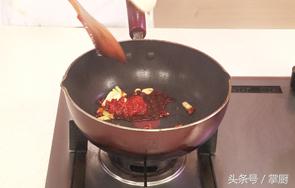 4. 放入备好的干辣椒,炒出香味,放入黄豆酱、辣椒酱。
