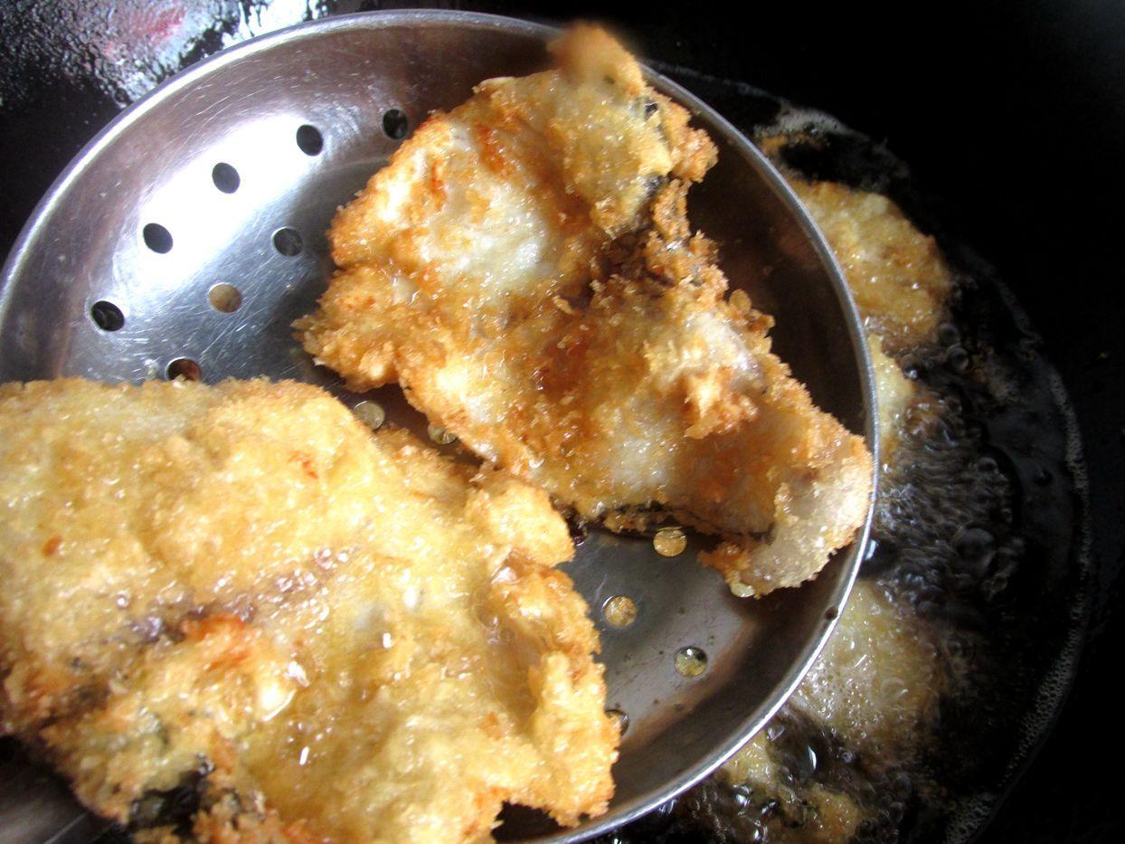 5、将鱼片入热油锅炸呈黄色且皮酥内嫩时,起锅装盘,镶上生菜即可。