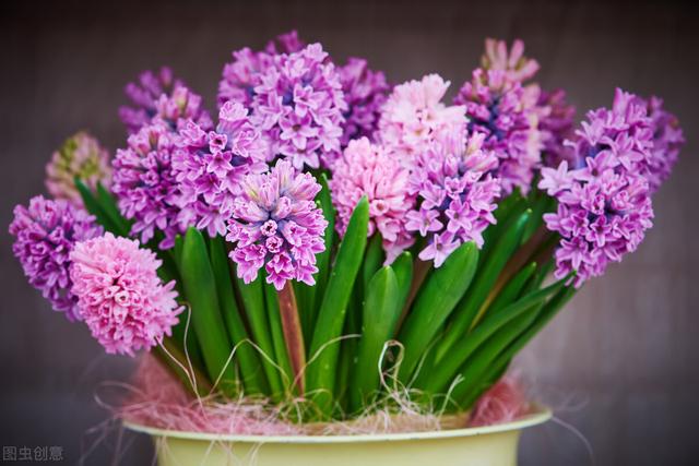 3、风信子,它的花语:胜利、竞技、喜悦、爱意、幸福、浓情、倾慕、顽固、生命。有蓝色、紫色、黄色、粉色颜色的种类很多,适合放在办公桌上,风信子是蛮好养殖的一种室内花卉,可土培也可水培,将风信子放置在阴凉、避光、通风良好的地点,温度保持在9°C至13°C就可以开花。