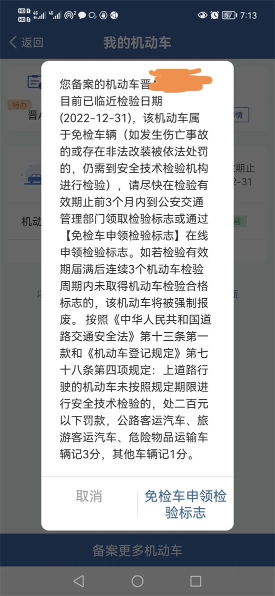 登录12123App页面有免检车辆检验标志申请
