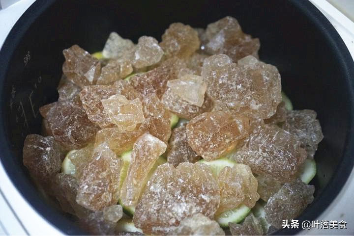 3、在柠檬上面放上一层冰糖,柠檬和冰糖的量大概是1:1.5,冰糖一定要买黄色的老冰糖。