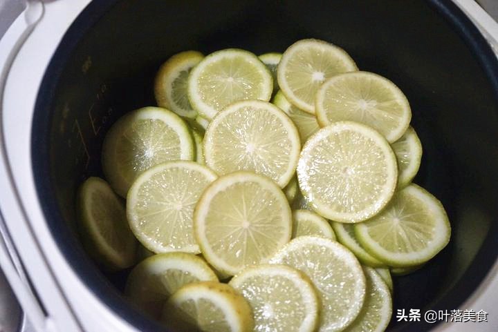 2、柠檬擦干表面水分,之后切片,放在一个干净无水的电饭锅里,锅一定要洗干净,并擦干水气。