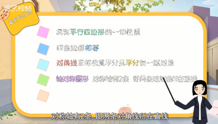 菱形的性质有五条,首先第一条是菱形具有平行四边形的一切性质;其次,菱形的四条边都相等;然后,菱形的对角线互相垂直平分且平分每一组对角;再然后,菱形是轴对称图形,对称轴有2条,即两条对角线所在直线;最后,菱形是中心对称图形。