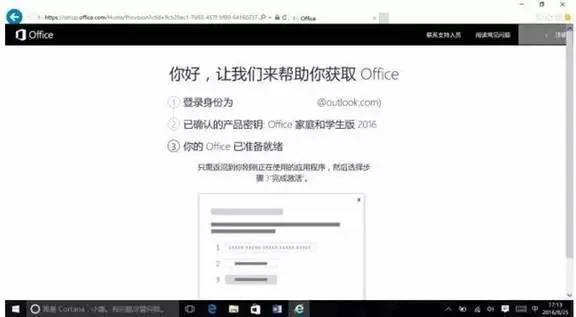 注意:如果用户的微软账户捆绑有 Office 365,使用该账户登录将自动转换为相关版本的Office 365。如用户想单独使用 Office 家庭和学生版 2016,请注册新账户。