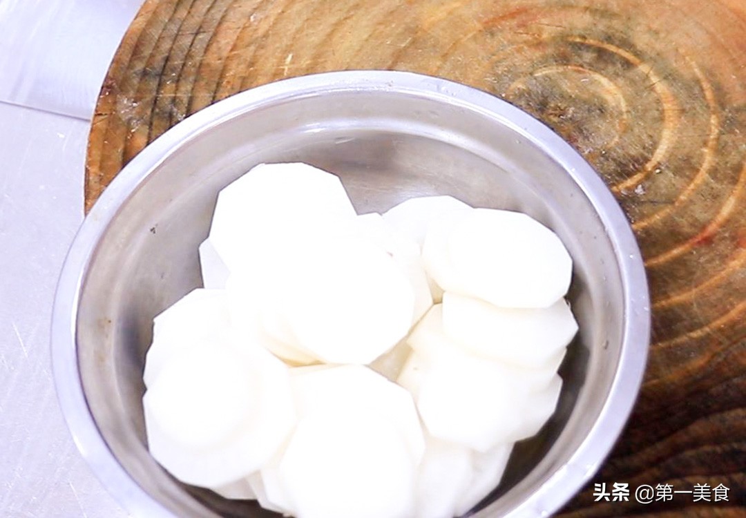 趁着这个时间,我们准备一个白萝卜,把外皮削干净切成厚片,放入清水中洗干净,待会和猪棒骨一起炖能够解油腻。