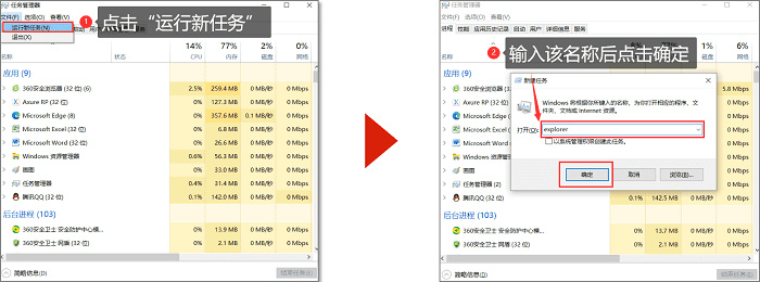 方法二:启动任务管理器箭头→运行新任务→输入“explorer“点确定即可。