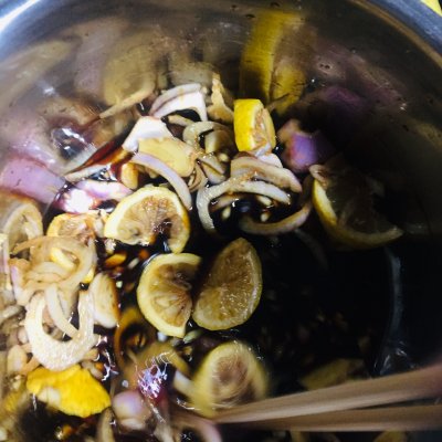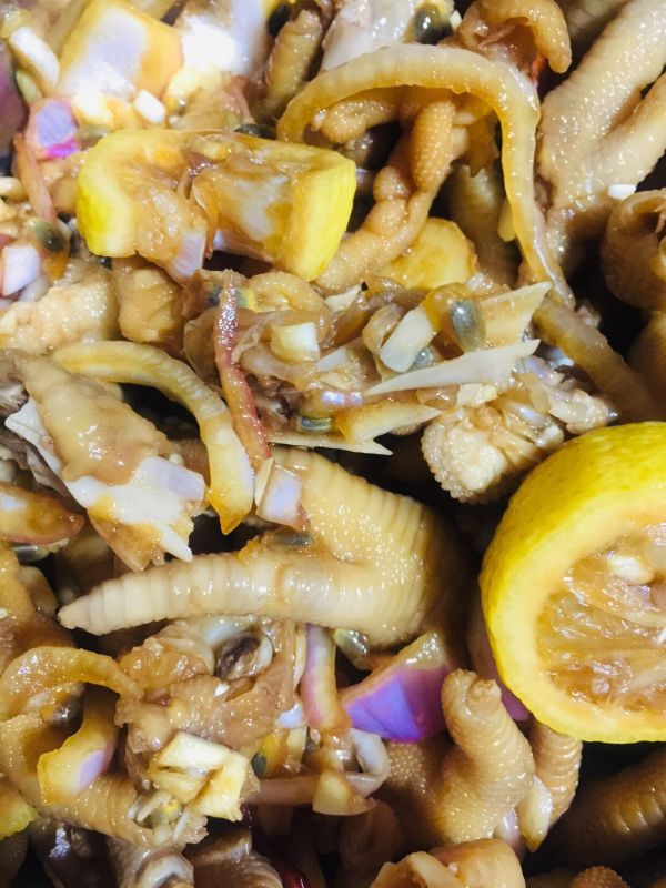 鸡爪 1000克 柠檬 1个 洋葱 1个 百香果 2个 蒜 10瓣 米醋 100克 生抽 100克 白糖 30克 盐 6克 姜片 8片 料酒 20克
