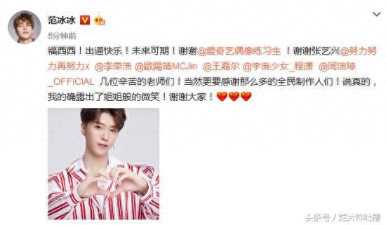 范冰冰未能到场加油,比赛前特地发微博喊话:「4个多月的努力,今天总决赛,姐姐今天为你打Call(加油)。在证明你自己的路上,坚持下去,无论结果如何,请享受所有的过程,加油!」得知弟弟拿下好成绩后,她立即发文祝贺,「福西西!出道快乐!未来可期!说真的,我的确露出了姐姐般的微笑!谢谢大家! 」