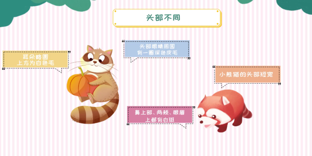 小熊猫:小熊猫的头部短宽,鼻上部、两颊、眼眉上都有白斑。