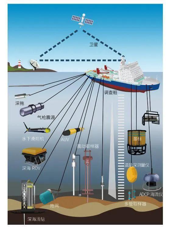 海底地震勘探技术示意图(供图:广州海洋地质调查局)这种声学遥测手段可清晰探测甲烷渗漏到海水中形成的气泡羽状流,在发现甲烷渗漏和预测可燃冰方面有重要作用。包括海底摄像和深海遥控潜水器(ROV)等。ROV除了有摄像功能外,还可通过搭载重力取样器、深海浅钻、柱状取样器和拖网等装置,采集海水样品以及测量海洋温度、盐度和深度。2.给海洋做“三维彩色B超”的多波束测量技术。3.给海底“采血”的近海底探测技术。