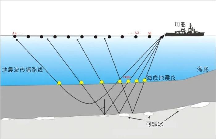由于甲烷是比二氧化碳更高效的温室气体,可燃冰试采过程中容易发生不可控分解,导致甲烷泄漏,引起海底滑坡等地质灾害,甚至是甲烷泄漏到海洋或者大气,从而引起环境问题,那么如何才能安全地探测到它呢?它的原理是根据人工激发的地震波在地下岩层中的传播路线和时间,探测岩层界面的埋深和形状,认识地质构造进而寻找可燃冰矿藏。地震勘探技术的优势是能够实现大面积勘探来确定可燃冰分布区域和特征。1.海底地震勘探技术。