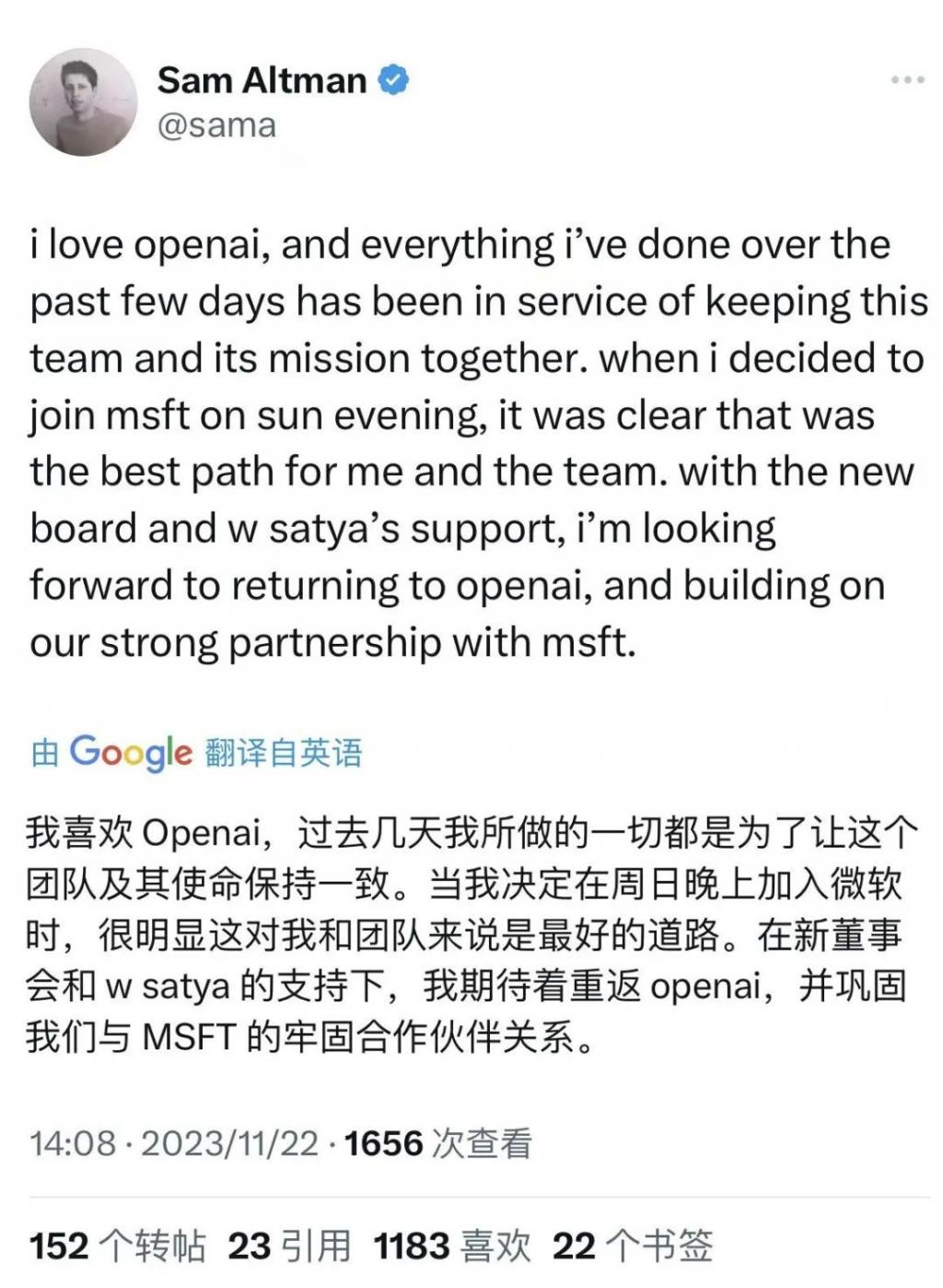 他在这次事件里是受害者。这么厉害的人物,被董事会说开除就开除,还仅提前一天才得知自己被解雇的消息。而支持他的董事会前主席格雷格 · 布罗克曼(Greg Brockman)则仅提前不到 10 分钟才得到通知,他也很快公开声明辞职,后跟随奥特曼一起加入微软 AI 团队。