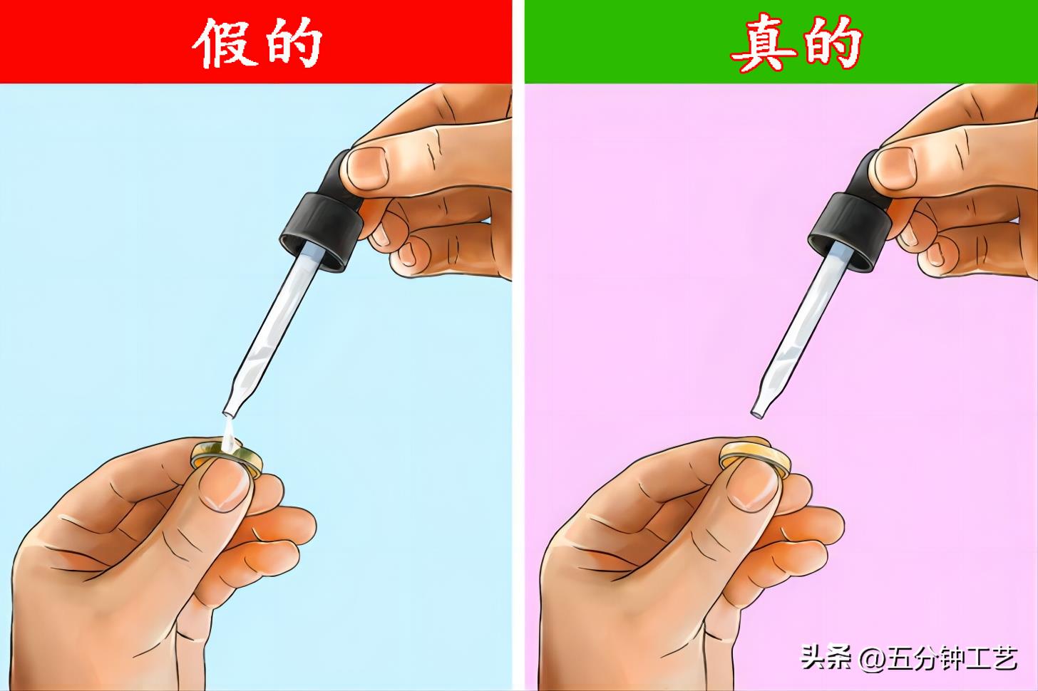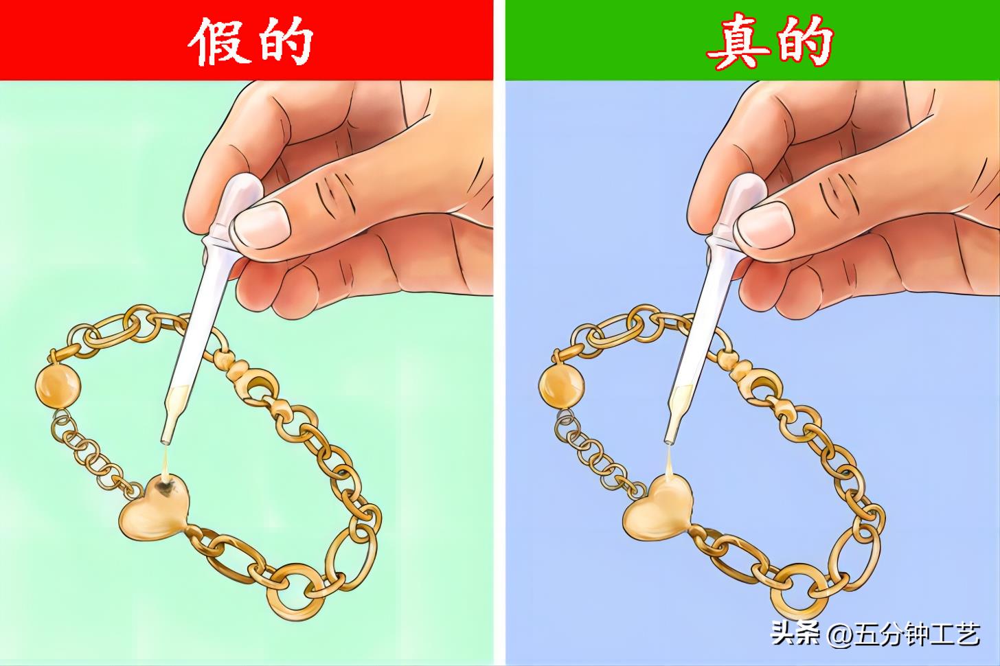 首先在滴管中注入白醋,然后用一只手握住黄金,在上面滴几滴白醋。如果表面变色,那就是假的;如果表面颜色不变,则为真的。