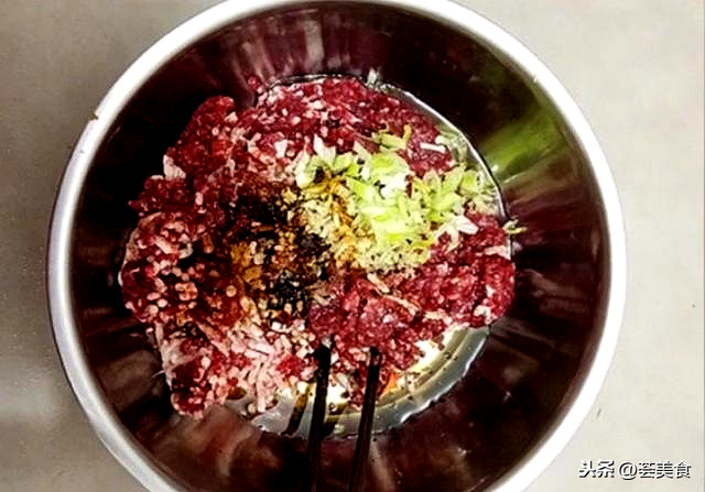 2.开始做牛肉馅了,牛肉是买的整块的清洗干净剁吧剁吧,嫌费事就用绞肉机或者直接买牛肉馅回来,肉馅里加入葱姜碎末、撒点花椒粉、老抽1汤匙、生抽1汤匙、白胡椒粉1小撮、食盐一丢丢、食用油进行调味,拌好了加入点香油,这样才能做出喷喷香的牛肉馅。
