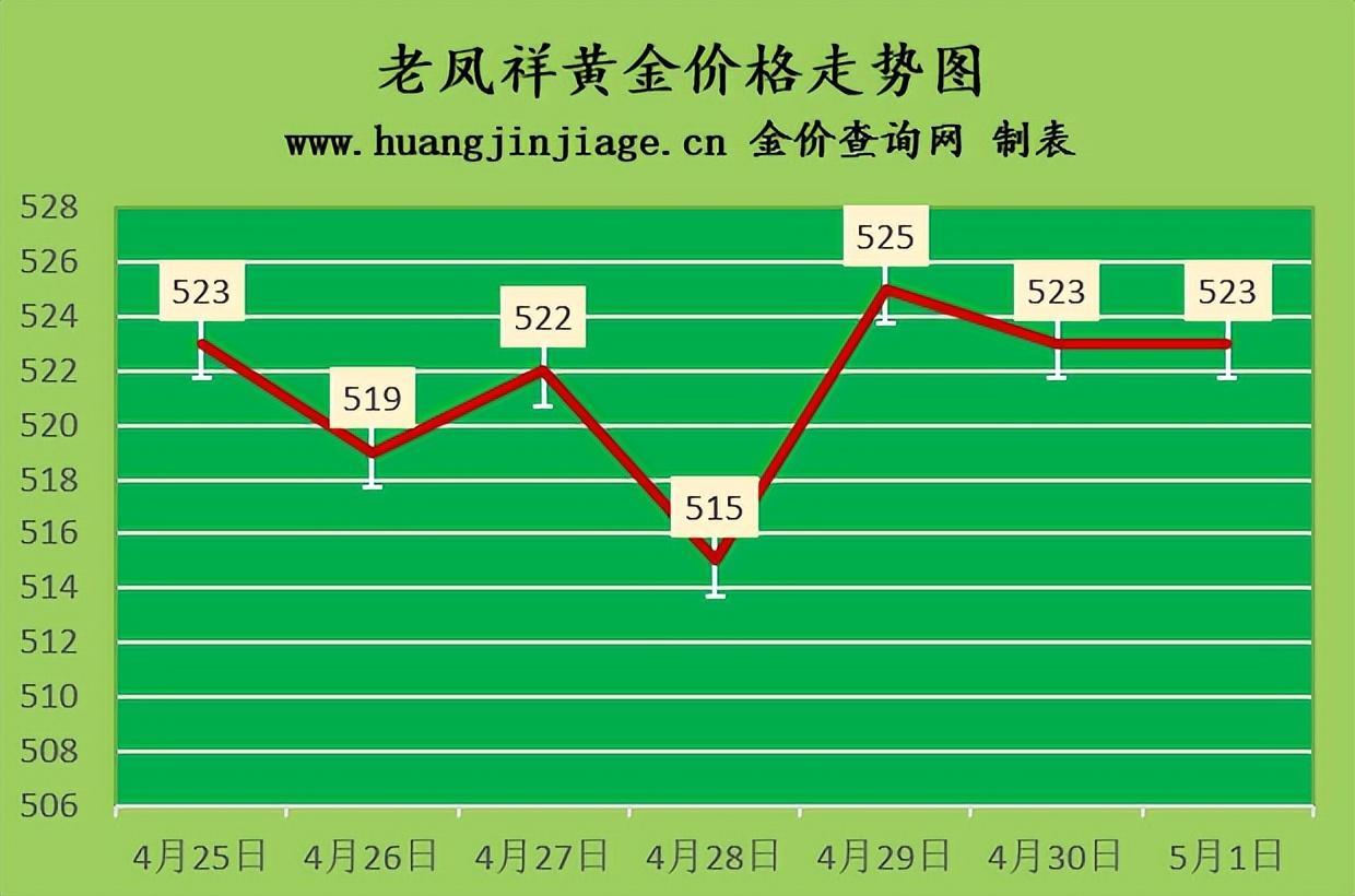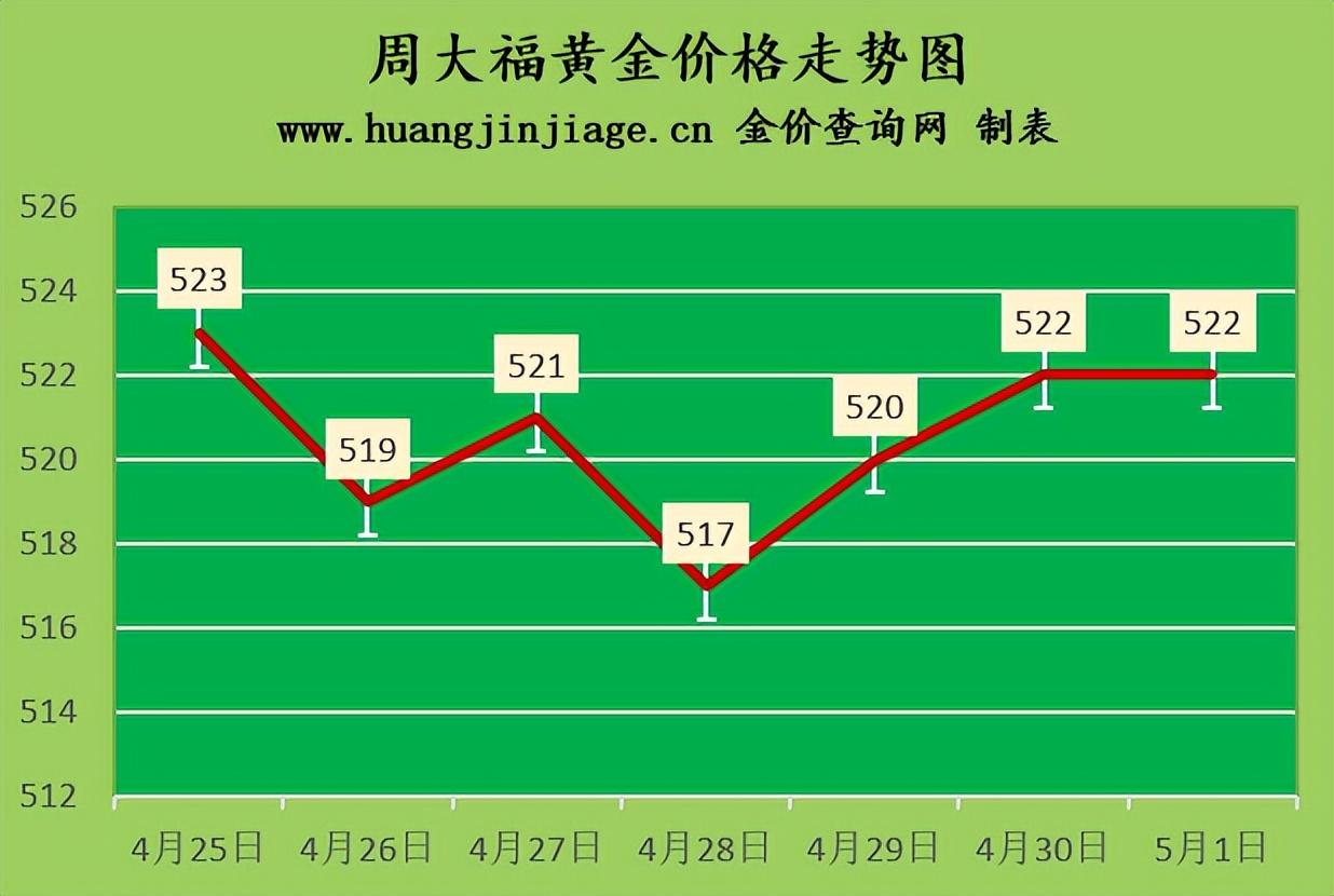 ),六福黄金价格522元/克(涨2元),周生生黄金价格523元/克(