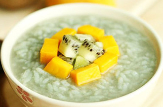 6.将猕猴桃和芒果切小块,放入冷藏好的冰粥里,搅拌即可。