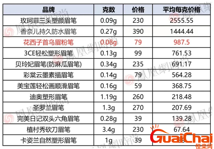 花西子首乌眉粉笔0.08g售价79元,单克价格987.5元。李佳琦直播间售价79元的花西子首乌眉粉笔赠送2支替换芯,也就是说79元到手的眉粉笔实际有0.24克,这么算的话单克价格329.16元,同样高于迪奥、圣罗兰,但比彩棠、美宝莲还是要便宜的。