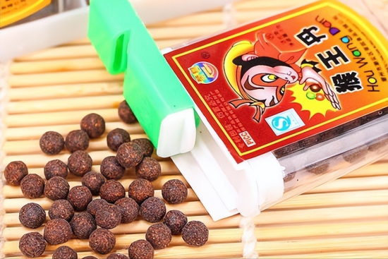 这种外形呈棕褐色颗粒状的小零食,小时候把它称作“老鼠屎”,虽说这昵称不太好听,但酸酸甜甜的口感,着实是馋倒了不少小朋友。除了“猴王丹”外,像“华华丹”、“济公丹”、“陈皮丹”等,其实都是同一类零食。