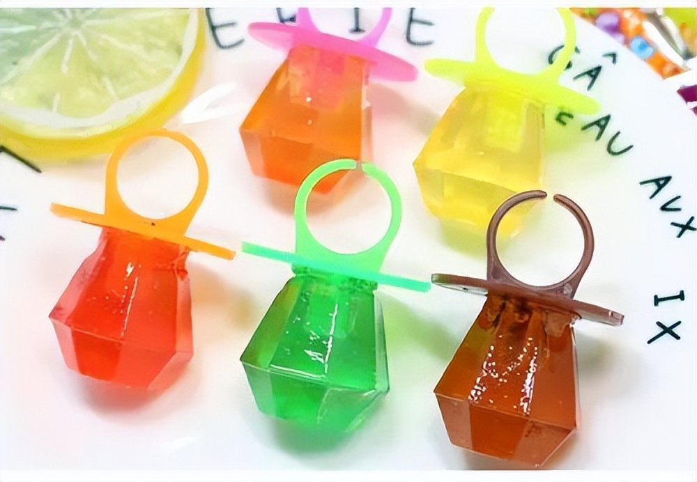 戒指糖,盛行于上个世纪90年代,本质是一种糖果,只是造型非常特别,固定在塑料制成的圆环戒指上,吃的时候可以像戒指一样戴在手上,然后慢慢品尝。这种零食格外受到女孩子们的喜欢。