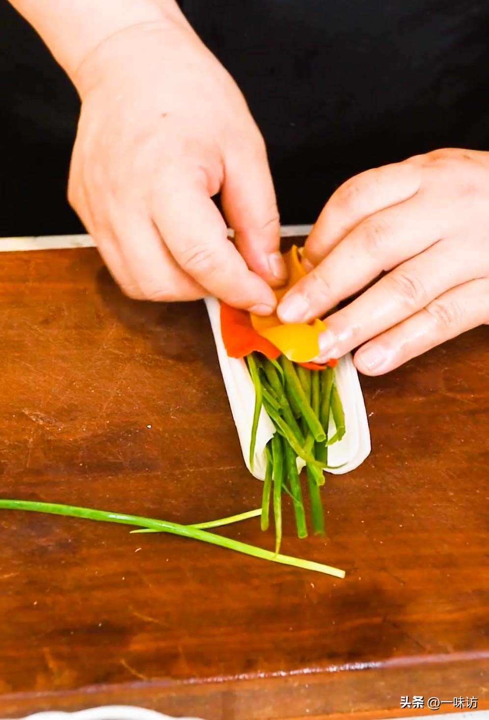 这里准备的是香葱、红椒和黄椒,把这三种食材切成细一些的丝放在盆里,用自来水冲一下控水。