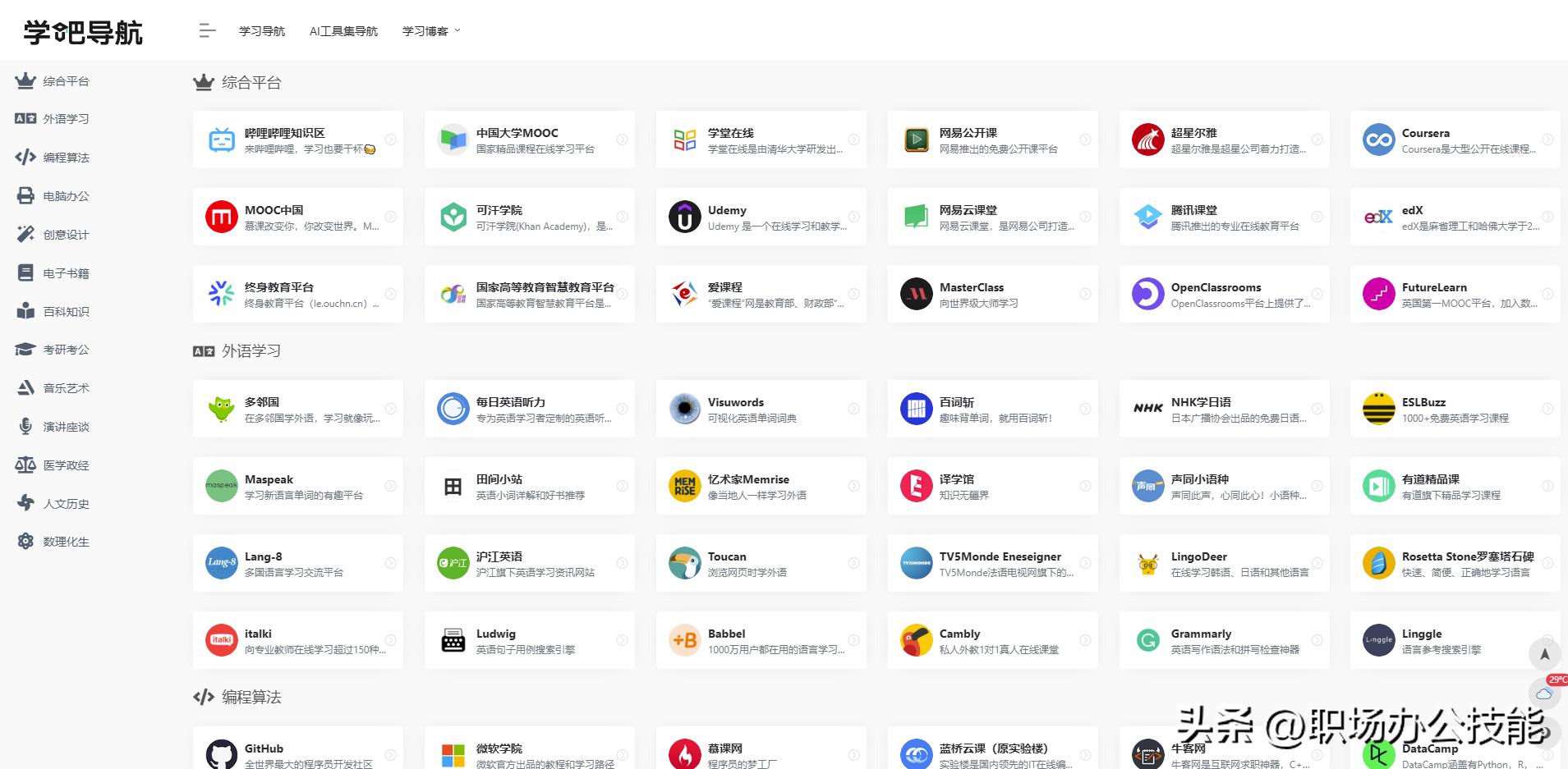 一个资源丰富的学习导航网站,里面收录了100多个优质的学习网站,覆盖综合平台、外语学习、编程算法、电脑办公、创意设计、考研考公、数理化生等类型。
